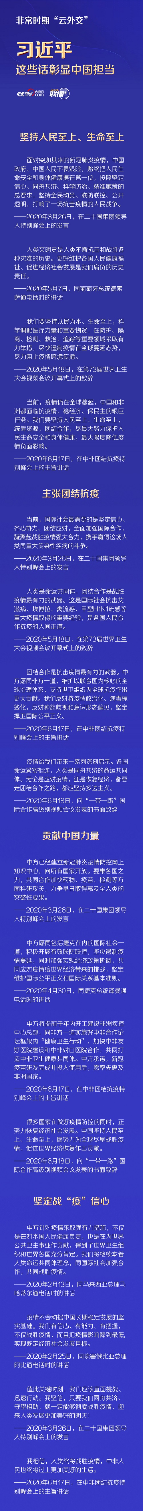 截至目前,習(xí)近平主席已經(jīng)同數(shù)十位外國(guó)領(lǐng)導(dǎo)人及國(guó)際組織負(fù)責(zé)人通話或見面,出席二十國(guó)集團(tuán)領(lǐng)導(dǎo)人應(yīng)對(duì)新冠肺炎特別峰會(huì),在第73屆世界衛(wèi)生大會(huì)視頻會(huì)議開幕式上致辭,主持中非團(tuán)結(jié)抗疫特別峰會(huì)并發(fā)表主旨講話等,開啟了以電話、書信、視頻為主渠道的“云外交”模式。