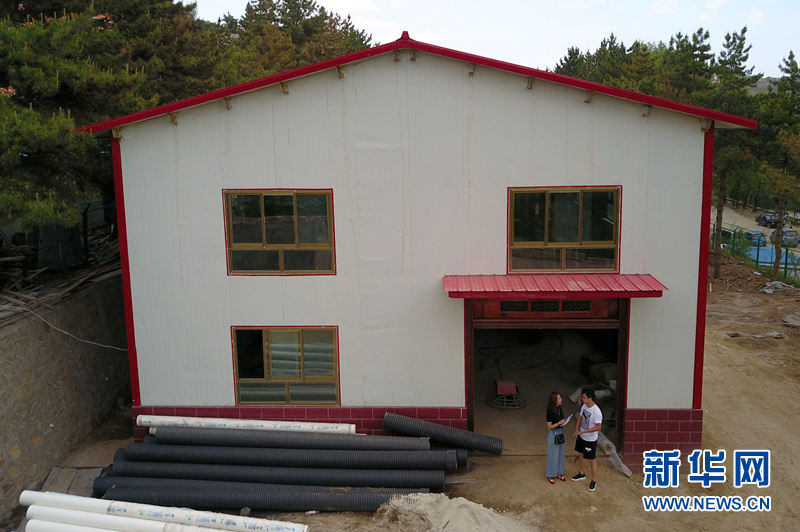 在東鄉(xiāng)族自治縣標(biāo)準(zhǔn)化食品生產(chǎn)加工車(chē)間建設(shè)現(xiàn)場(chǎng),馬娟(左)和朋友商量公司規(guī)劃。(資料圖)新華社記者 范培珅 攝