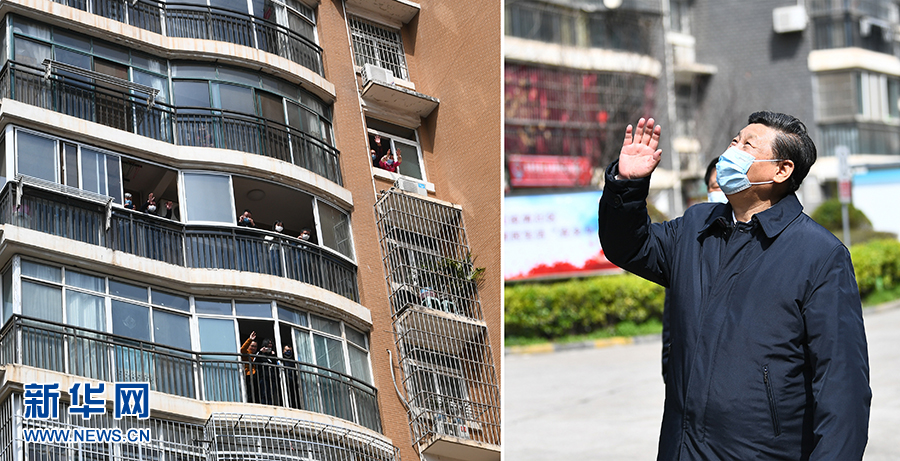 3月10日,習(xí)近平專(zhuān)門(mén)赴湖北省武漢市考察新冠肺炎疫情防控工作。這是習(xí)近平在東湖新城社區(qū)考察時(shí),向在家隔離居住的居民揮手致意、表示慰問(wèn)(拼版照片)。 新華社記者 謝環(huán)馳 攝