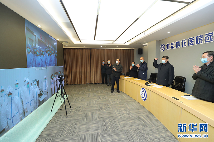 2月10日,習(xí)近平在北京調(diào)研指導(dǎo)新冠肺炎疫情防控工作。這是習(xí)近平在首都醫(yī)科大學(xué)附屬北京地壇醫(yī)院遠(yuǎn)程診療中心,通過(guò)視頻連線(xiàn)武漢市收治新冠肺炎患者的金銀潭醫(yī)院、協(xié)和醫(yī)院、火神山醫(yī)院,了解情況、聽(tīng)取意見(jiàn)和建議,慰問(wèn)一線(xiàn)醫(yī)務(wù)工作者。 新華社記者 鞠鵬 攝