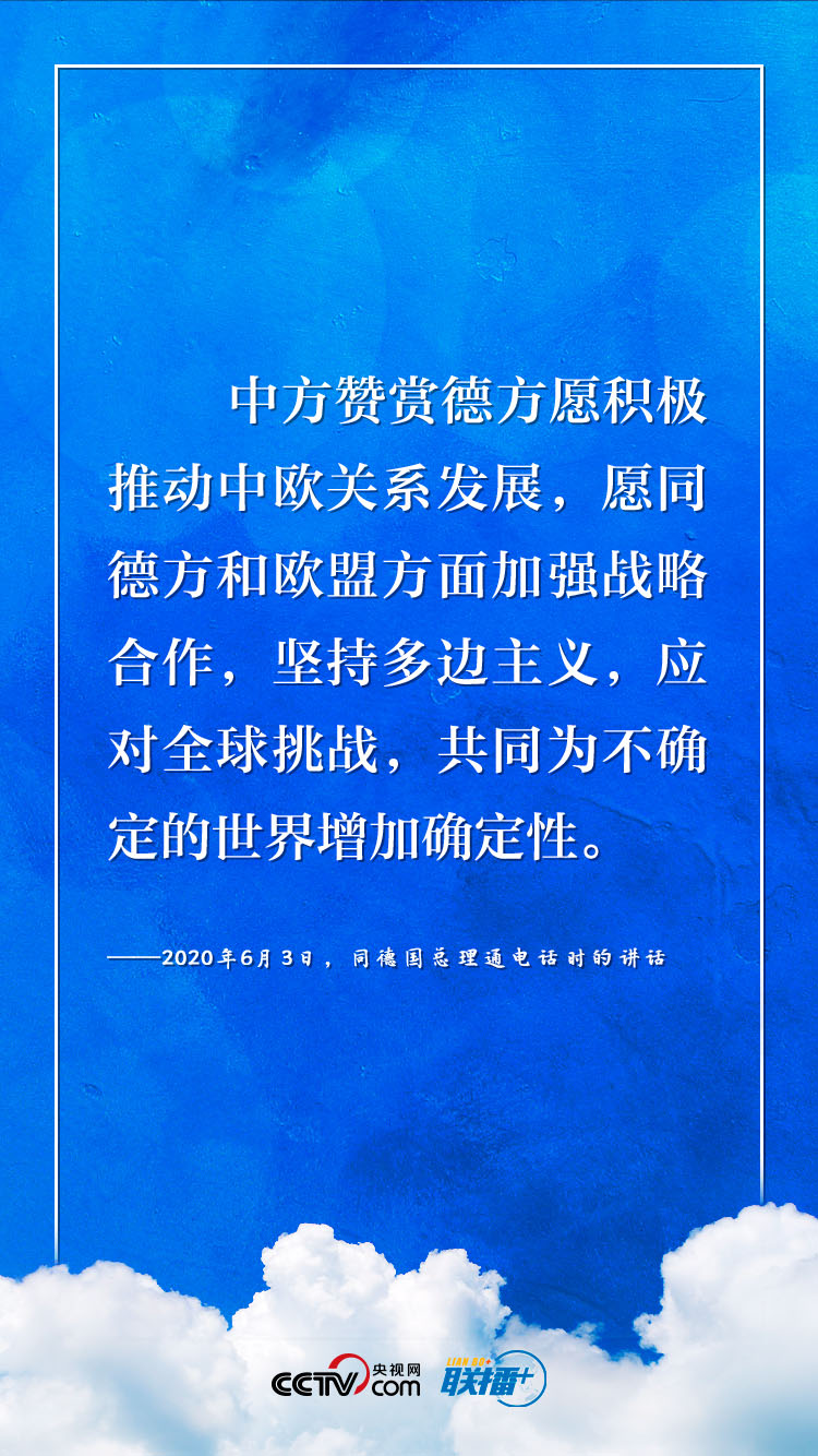 9月14日,習(xí)近平主席將以視頻方式同德國總理默克爾、歐洲理事會主席米歇爾、歐盟委員會主席馮德萊恩共同舉行中德歐領(lǐng)導(dǎo)人會晤?!堵?lián)播+》梳理今年以來習(xí)近平主席與德國、歐盟領(lǐng)導(dǎo)人“云外交”的部分講話,與您共同感受團結(jié)合作中蘊藏的深遠(yuǎn)意義。