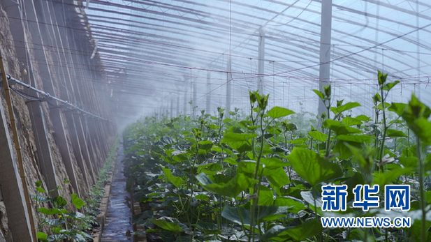 蔬菜大棚內,正在進行霧化澆水。新華網發(fā) (尹杰 攝)