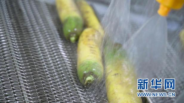 凈菜加工間內,自動化流水線上,正在清洗胡蘿卜。新華網發(fā) (尹杰 攝)
