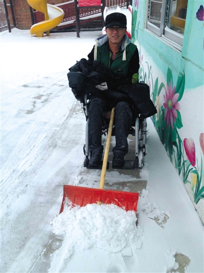 今年冬天,戴著假肢,坐著輪椅的宋學文在吉林老家掃雪。受訪者供圖