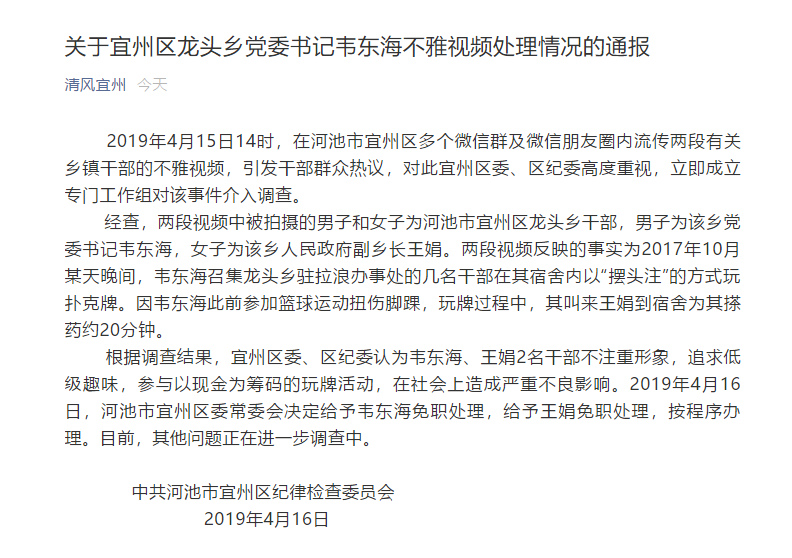 4月16日,中共河池市宜州區(qū)紀(jì)律檢查委員會發(fā)布通報。2019年4月15日14時,在廣西河池市宜州區(qū)多個微信群及微信朋友圈內(nèi)流傳兩段有關(guān)鄉(xiāng)鎮(zhèn)干部的不雅視頻, 經(jīng)查,兩段視頻中被拍攝的男子和女子為河池市宜州區(qū)龍頭鄉(xiāng)干部,男子為該鄉(xiāng)黨委書記韋東海,女子為該鄉(xiāng)人民政府副鄉(xiāng)長王娟。兩段視頻反映的事實(shí)為2017年10月某天晚間,韋東海召集龍頭鄉(xiāng)駐拉浪辦事處的幾名干部在其宿舍內(nèi)以“擺頭注”的方式玩撲克牌。因韋東海此前參加籃球運(yùn)動扭傷腳踝,玩牌過程中,其叫來王娟到宿舍為其搽藥約20分鐘。