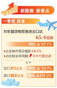 我省對(duì)東盟進(jìn)出口主要呈現(xiàn)以下特點(diǎn):從國(guó)別看,一季度我省對(duì)東盟10國(guó)進(jìn)出口值中,印度尼西亞居首位,進(jìn)出口32.9億元,占全省對(duì)東盟進(jìn)出口值的50.3%;其次為新加坡,進(jìn)出口13.5億元,占全省對(duì)東盟進(jìn)出口值的20.7%;對(duì)東盟10國(guó)的進(jìn)出口中有7國(guó)實(shí)現(xiàn)增長(zhǎng),其中對(duì)印度尼西亞和緬甸實(shí)現(xiàn)成倍增長(zhǎng)。我省對(duì)東盟出口機(jī)電產(chǎn)品19億元,同比增長(zhǎng)50.2%,占全省對(duì)東盟出口值的69.8%。主要進(jìn)口商品中,鐵合金出現(xiàn)大幅增長(zhǎng),各類(lèi)金屬礦及礦砂量減值增,我省自東盟進(jìn)口鐵合金11.5萬(wàn)噸、貨值18.9億元,分別增加14.4倍和增長(zhǎng)10.2倍,占全省自東盟進(jìn)口值的49.3%,全部來(lái)自印度尼西亞;進(jìn)口各類(lèi)金屬礦及礦砂29.6萬(wàn)噸,貨值5.8億元。