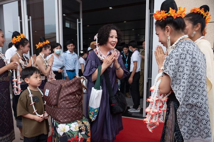 在中老鐵路老撾磨丁站,工作人員歡迎乘坐D887次國(guó)際旅客列車的旅客抵達(dá)磨?。?023年4月13日攝)。新華社發(fā)(凱喬 攝)