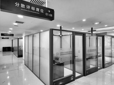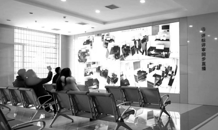 參觀完一層大廳后,工作人員將媒體觀摩團(tuán)帶到了四層一個(gè)全封閉的區(qū)域——評(píng)標(biāo)區(qū),隨機(jī)抽取的專家會(huì)在這里進(jìn)行評(píng)標(biāo)工作。代表們首先是被一系列的科技防范“硬措施”所震撼,人臉識(shí)別身份核驗(yàn)機(jī)、金屬探測門防范冒名頂替,通信設(shè)備存儲(chǔ)柜、文件傳送智能機(jī)器人阻斷不必要的溝通,軌跡定位卡、電子呼叫系統(tǒng)、電子門牌等技術(shù)的應(yīng)用實(shí)現(xiàn)了對交易人員身份類別權(quán)限的精準(zhǔn)管控……還有全方位、超高清、永久保存的監(jiān)控設(shè)備,實(shí)時(shí)對外直播的電子大屏,實(shí)現(xiàn)了嚴(yán)密管控、處處震懾。