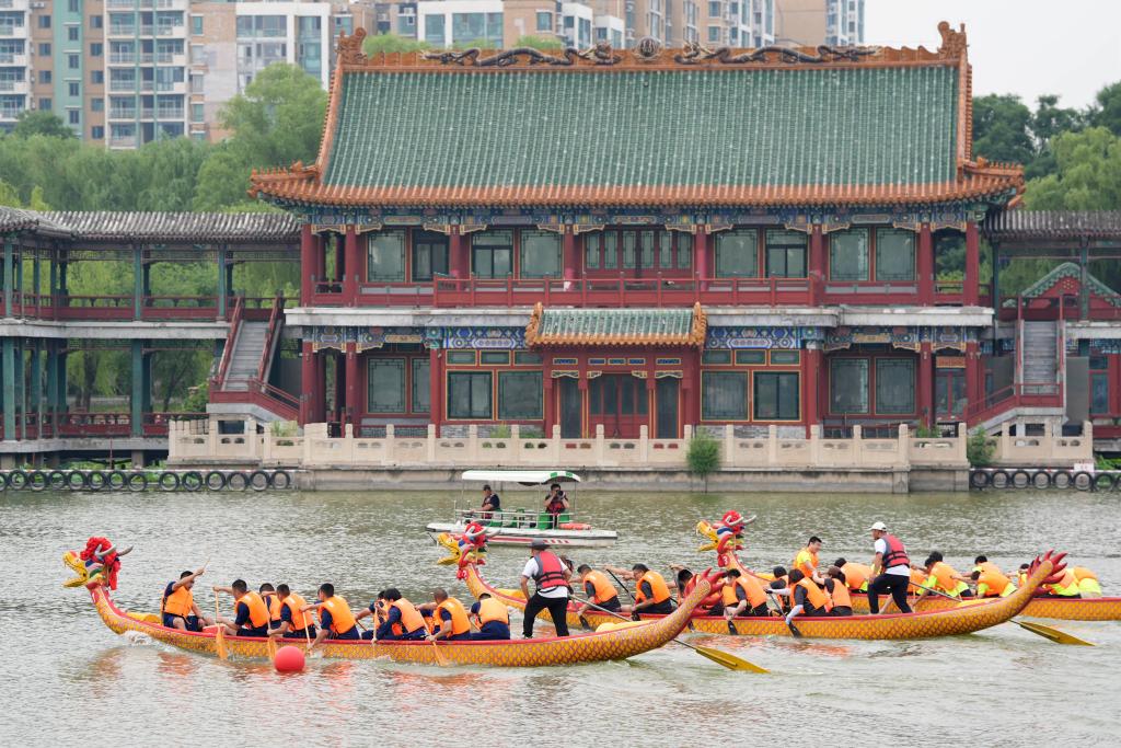 6月5日,2024龍?zhí)抖宋缥幕?jié)活動(dòng)在北京市東城區(qū)龍?zhí)豆珗@舉辦。這是2024龍?zhí)抖宋缥幕?jié)龍舟比賽現(xiàn)場(chǎng)。新華社記者 鞠煥宗 攝