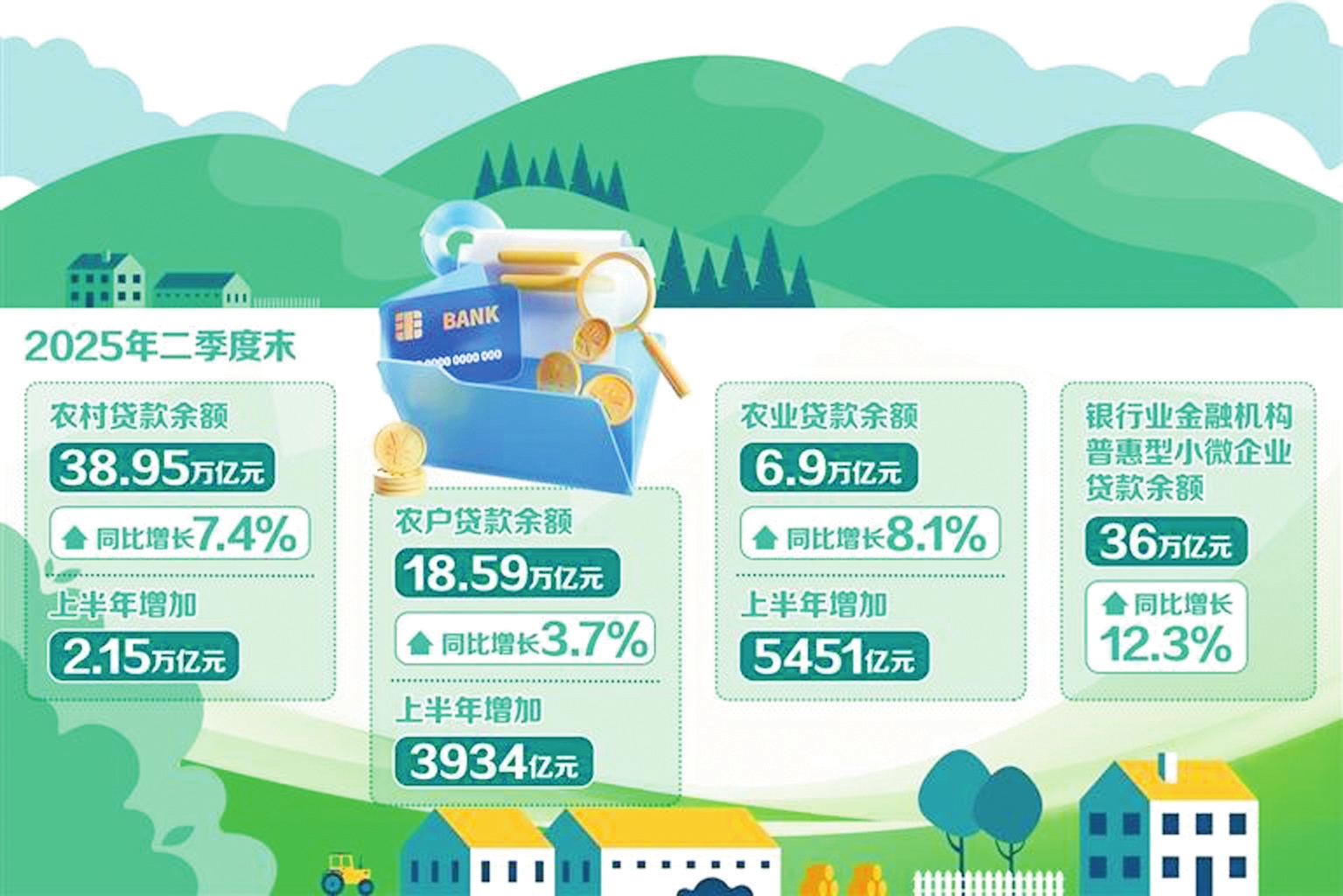 總的來(lái)看,今年二季度涉農(nóng)金融投放增量擴(kuò)面。2025年二季度金融機(jī)構(gòu)貸款投向統(tǒng)計(jì)報(bào)告顯示,2025年二季度末,農(nóng)村貸款余額38.95萬(wàn)億元,同比增長(zhǎng)7.4%,上半年增加2.15萬(wàn)億元。農(nóng)戶(hù)貸款余額18.59萬(wàn)億元,同比增長(zhǎng)3.7%,上半年增加3934億元。農(nóng)業(yè)貸款余額6.9萬(wàn)億元,同比增長(zhǎng)8.1%,上半年增加5451億元。