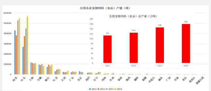 中國農(nóng)業(yè)科學(xué)院飼料研究所寵物營養(yǎng)團隊針對2021年至2024年全國各寵物飼料(食品)產(chǎn)量的分析(中國農(nóng)業(yè)科學(xué)院飼料研究所寵物營養(yǎng)團隊供圖)