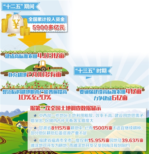 同時,對耕地的建設性保護也迫在眉睫?!敖ㄔO性保護指通過工程措施改善耕地質量?!敝醒朕r辦副主任韓俊介紹,近年來,國家大力推進土地整治與高標準農田建設,有效彌補了耕地產能損失。僅高標準農田建設一項,“十二五”期間,全國累計投入資金5900多億元,建成高標準農田4.03億畝,補充耕地2700多萬畝,整治后的耕地糧食產能普遍提高10%至20%。“十三五”時期,要確保建設高標準農田4億畝,力爭建成6億畝。