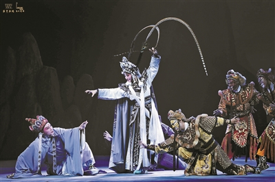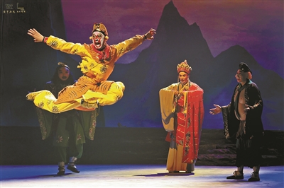 此外,該劇還利用舞臺(tái)技術(shù)突破了傳統(tǒng)戲曲的節(jié)奏,使之更為緊湊連貫。比如白骨精定下計(jì)謀要去偵探唐僧情況時(shí),舞臺(tái)光暗,一個(gè)發(fā)光小球飛升直達(dá)天幕,暗示白骨精元神飛出洞府,同時(shí)伴有類(lèi)似影視音效作為烘托;而在唐僧狠心驅(qū)逐孫悟空時(shí),孫悟空向八戒沙僧交代完后,從上場(chǎng)門(mén)下場(chǎng),后場(chǎng)馬上就安排一個(gè)孫悟空替身吊威亞從上場(chǎng)口飛到下場(chǎng)口,過(guò)程連貫自然,這都是受到電影藝術(shù)啟發(fā)的創(chuàng)新。