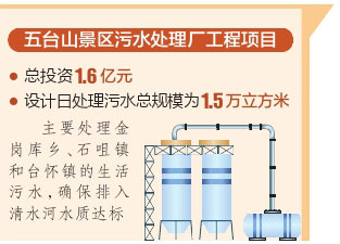 五臺(tái)山景區(qū)污水處理廠工程項(xiàng)目總投資1.6億元,設(shè)計(jì)日處理污水總規(guī)模為1.5萬立方米,主要處理金崗庫鄉(xiāng)、石咀鎮(zhèn)和臺(tái)懷鎮(zhèn)的生活污水,確保排入清水河水質(zhì)達(dá)標(biāo)。
