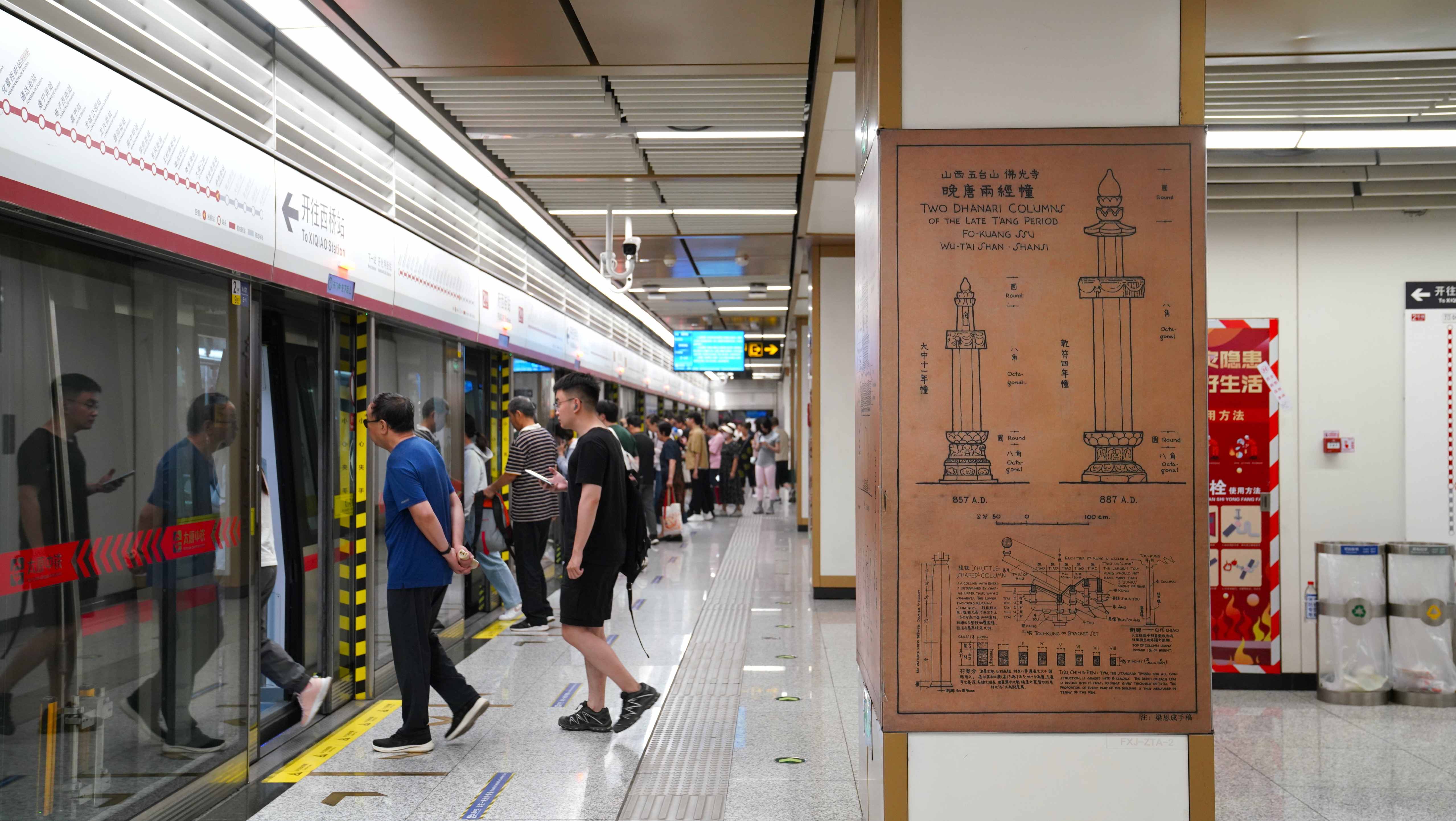連永樂(lè)宮壁畫(huà)的絢麗、云岡石窟大佛的莊嚴(yán)、應(yīng)縣木塔的精巧,都被藝術(shù)復(fù)刻在站廳里——等車(chē)的間隙,有人會(huì)盯著壁畫(huà)上的飛天出神,有人會(huì)摸著梁思成筆下的古塔紋路發(fā)呆,匆忙的通勤路,忽然就多了份文化的滋養(yǎng)。