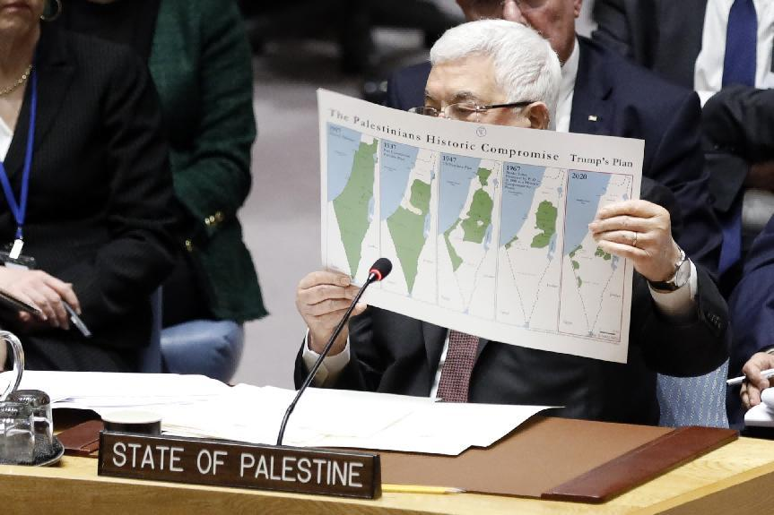 ??2020年2月11日,在位于紐約的聯(lián)合國(guó)總部,巴勒斯坦總統(tǒng)阿巴斯在安理會(huì)中東局勢(shì)和巴勒斯坦問(wèn)題公開會(huì)上手持地圖發(fā)言。 新華社記者 李木子 攝