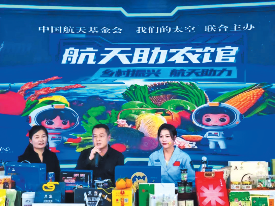 甄繼榮(中)在村航天助農(nóng)館直播銷售特色農(nóng)產(chǎn)品