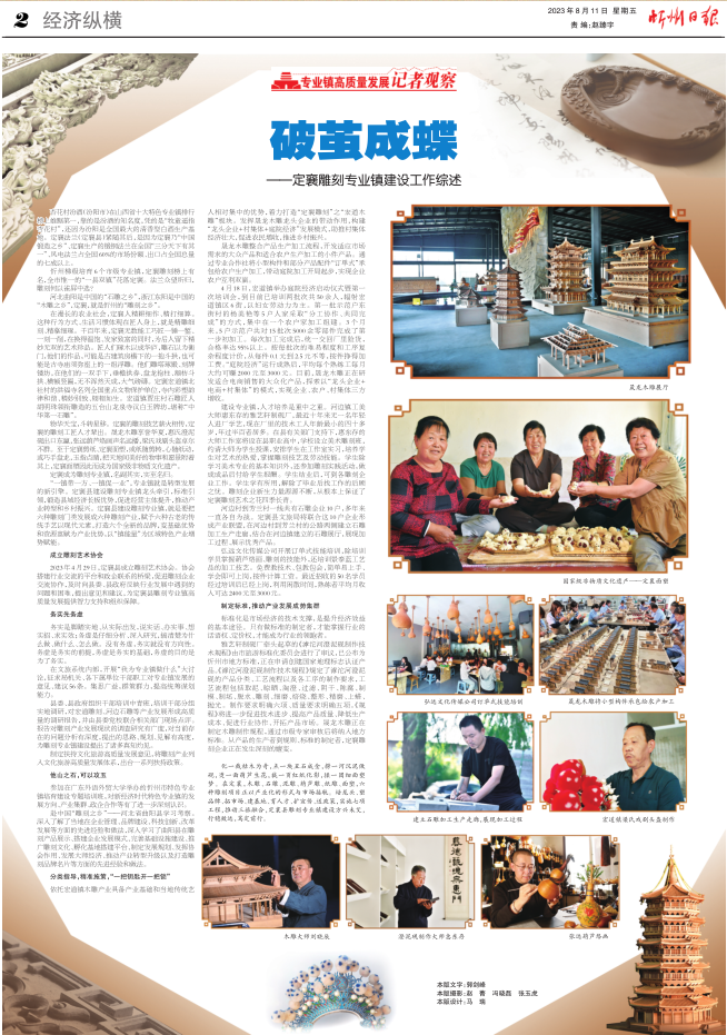 今年以來,定襄縣把雕刻專業(yè)鎮(zhèn)建設(shè)作為加快產(chǎn)業(yè)轉(zhuǎn)型升級(jí)、推進(jìn)市場主體倍增、發(fā)揮縣域特色優(yōu)勢(shì)、鍛造發(fā)展長板的重要抓手,充分發(fā)揮本縣雕刻產(chǎn)業(yè)的基礎(chǔ)優(yōu)勢(shì)和資源稟賦,培龍頭、塑品牌、拓市場、建基地、育人才、擴(kuò)宣傳、送政策,以特色專業(yè)鎮(zhèn)建設(shè)為高質(zhì)量發(fā)展注入新動(dòng)能。