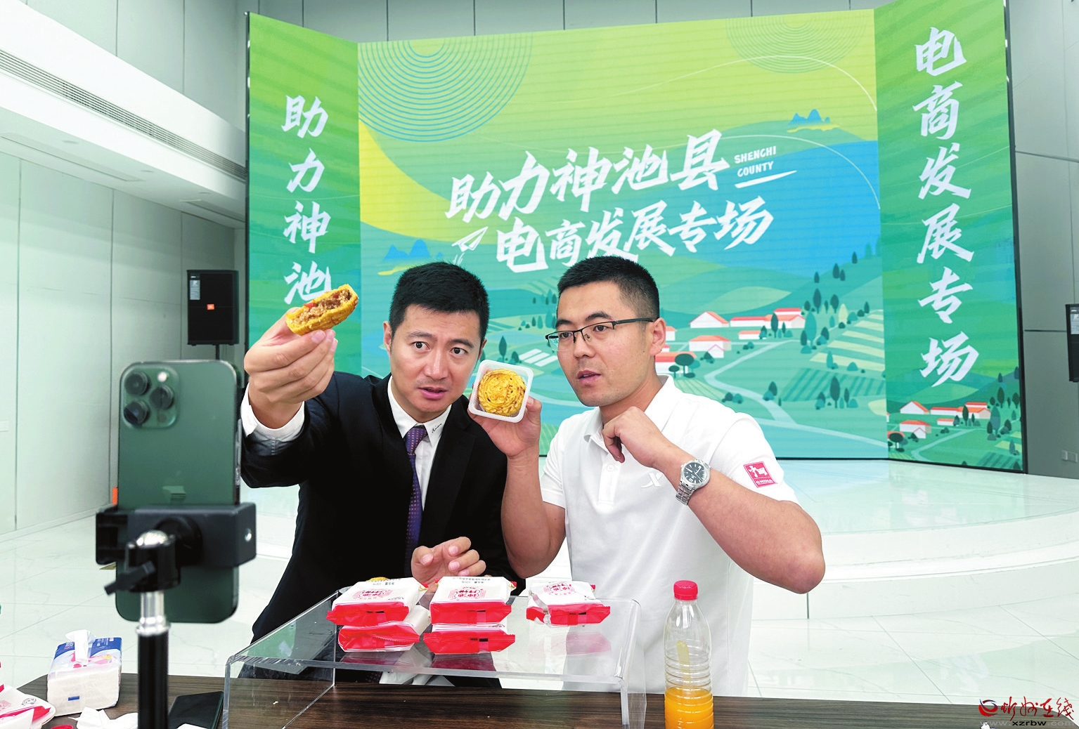 知名網(wǎng)紅王寶(左)與神池兄弟月餅青年主播高永勝(右)共同直播銷(xiāo)售神池餅。 鄭志東攝