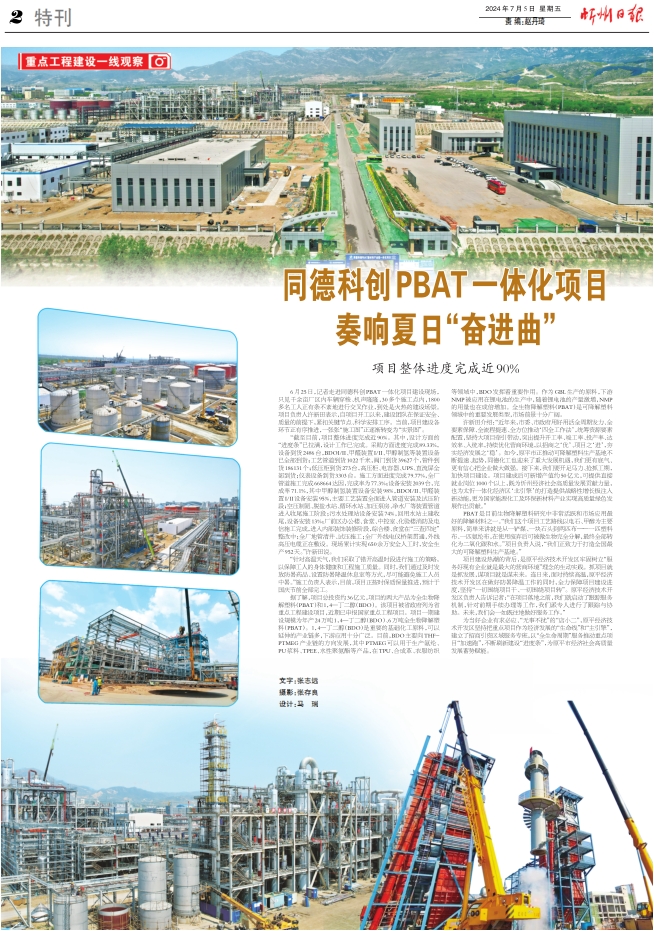 6月25日,記者走進同德科創(chuàng)PBAT一體化項目建設(shè)現(xiàn)場,只見千余畝廠區(qū)內(nèi)車輛穿梭、機聲隆隆,30多個施工點內(nèi),1800多名工人正有條不紊地進行交叉作業(yè),到處是火熱的建設(shè)場景。項目負責人許新田表示,自項目開工以來,建設(shè)團隊在保證安全、質(zhì)量的前提下,緊扣關(guān)鍵節(jié)點、科學(xué)安排工序。當前,項目建設(shè)各環(huán)節(jié)正有序推進,一張張“施工圖”正逐漸轉(zhuǎn)變?yōu)椤皩嵕皥D”。