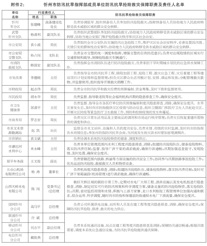2.忻州市防汛抗旱指揮部成員單位防汛抗旱搶險(xiǎn)救災(zāi)保障職責(zé)及責(zé)任人名單