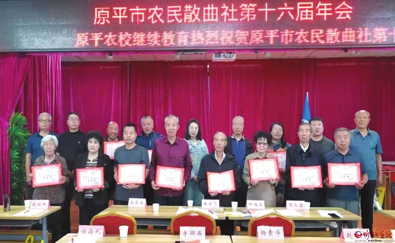 散曲社朗誦部的曲友們?cè)谟茡P(yáng)音樂(lè)聲中,激情澎湃地朗誦著五谷飄香的農(nóng)民散曲,20多名優(yōu)秀社員受到表彰,展示出原平農(nóng)民散曲的喜慶豐收景象?!霸?shī)如潮,農(nóng)民種曲名聲在,情如火,南腔北調(diào)心澎湃。曲如海,同舟共濟(jì)承傳愛(ài),暖如春,一年四季花不敗。花開(kāi)滿地鮮,曲韻熔天籟,好一個(gè)震驚曲界田園派。”這首散曲《正宮·塞鴻秋》道出了散曲社社員們的心聲。