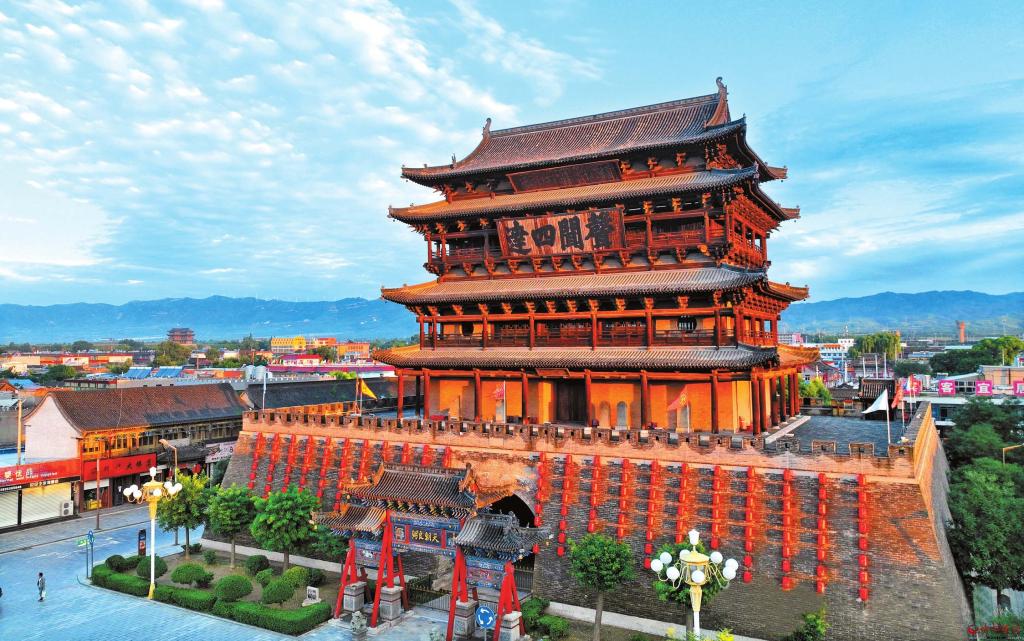 邊靖樓位于縣城中央,又名譙樓,俗稱鼓樓,始建于明洪武七年(1374年),被著名長(zhǎng)城專家羅哲文譽(yù)為“萬(wàn)里長(zhǎng)城第一樓”。成化七年(1471年),被火焚毀;成化十二年(1476年),由都督僉事劉寵、副使蔡麟加臺(tái)重建。樓通高40米,由磚砌臺(tái)基、木構(gòu)樓身和登臺(tái)步道三部分組成。樓身面寬七間,進(jìn)深五間,三層四檐歇山頂,四周設(shè)圍廊。樓南三層懸“聲聞四達(dá)”匾,長(zhǎng)10.02米,寬3.15米;樓北三層懸“威鎮(zhèn)三關(guān)”匾,長(zhǎng)10.2米,寬2.9米。此兩塊巨匾不僅為現(xiàn)存國(guó)內(nèi)最大的木質(zhì)古牌匾,也是亞洲最大的木質(zhì)古牌匾。
