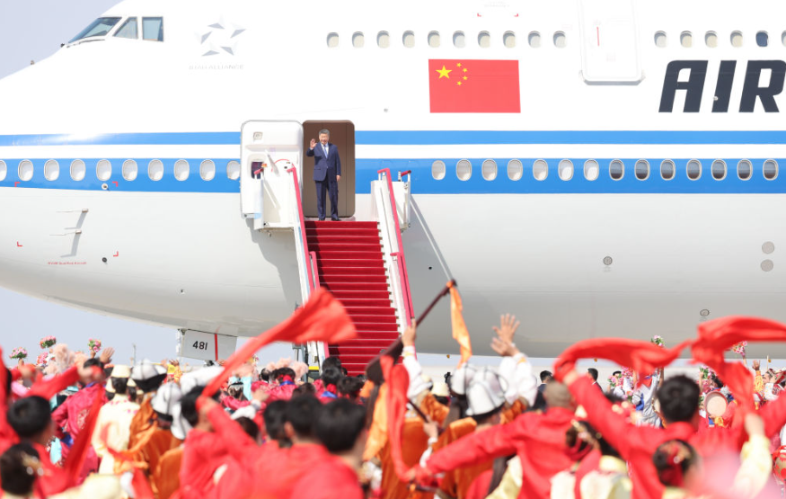 習近平總書記走出艙門,向歡迎群眾揮手致意。