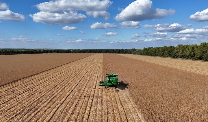 2025年9月19日,在北大荒集團(tuán)黑龍江格球山農(nóng)場(chǎng)有限公司大豆地塊,收獲機(jī)車(chē)在進(jìn)行收獲作業(yè)(無(wú)人機(jī)照片)。新華社發(fā)(陸文祥攝)