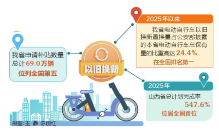 2025年以來,我省電動自行車以舊換新置換量占公安部披露的本省電動自行車總保有量的比重高達(dá)24.4%,在全國排名第一。以2025年全國建議工作量計(jì)算,山西省的總計(jì)劃完成率達(dá)到547.6%,位居全國首位。